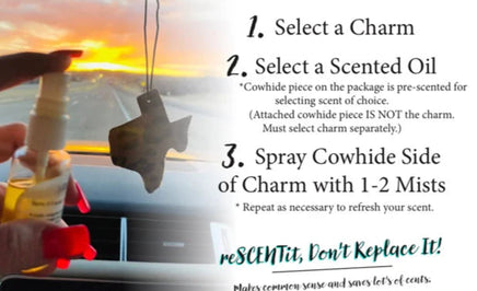 Purchase 1 car charm and a bottle of scent and you will have a years' worth of freshness for your vehicle!