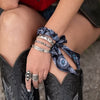 Black Turquoise and Conchos Twilly is a little bit wild, a little bit luxe—where Western edge meets high-end escape. Simple and easy to incorporate into any outfit.... from adding to your neckline to wrapping around your wrist several times along with some silver cuff bracelets. And don't forget adding a Fringe Twilly to your favorite purse handle. One of my all-time favorite scarves is a Twilly I purchased years ago. A great way to add color for a more minimalist look!