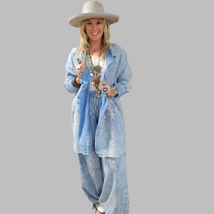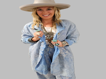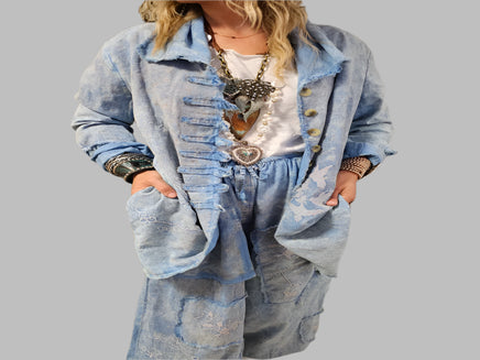 - This is amazing! Oversized and distressed in a sky blue, this jacket is cross stitched in neutrals and is absolutely stunning!