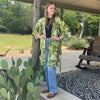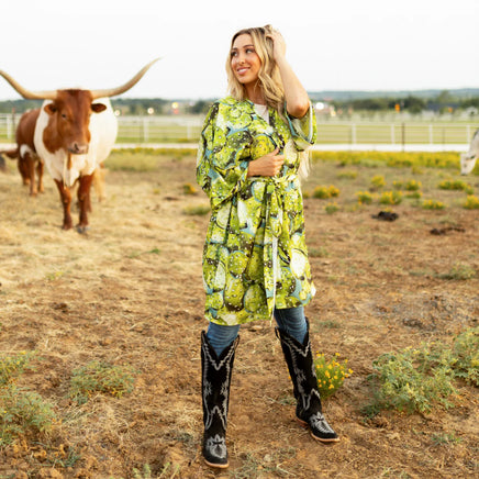 The Prickly Pear kimono robe, perfect for lounging around or getting ready in the morning. You can also throw it on with your favorite cami, skinny jeans and some tall top boots for a night out. Whether you are going from your bed to grab some coffee, or covering up after a swim, this versatile piece is sure to turn some heads.