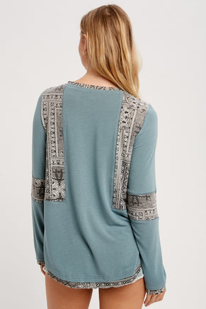 - Aztec printed knit fabric Round boat neckline with contrast fabrication on edge