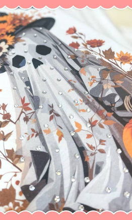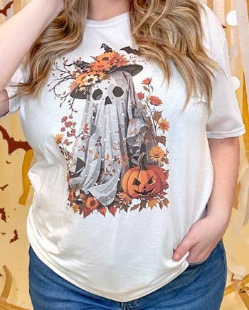 - Graphic t-shirt's design features a spooky sheet ghost, wearing a witch hat, with orange and brown autumn foliage all over and with a pumpkin and a bat nearby. Clear rhinestones are applied to the ghost portion of the design.