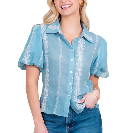 - Ballon short sleeve button down blouse with novelty/ lace detail -