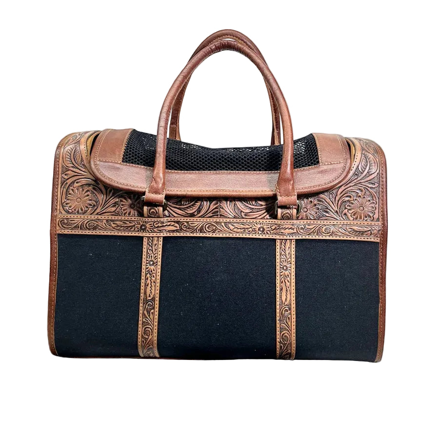 - Carry your furry friend in style with our handcrafted tooled leather pet carrier. Durable, comfortable, and designed with intricate leather detailing, it’s perfect for travel or everyday outings while keeping your pet safe and cozy.